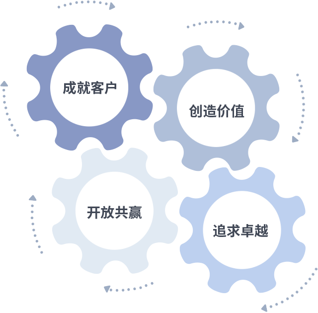 成就客户是一切决策的出发点,,,,创造价值是衡量所有工作的标准,,,,追求卓越是我们做事做人的态度,,,开放共赢是我们的格局也是最终的结果。。价值观的齿轮环环相扣,,,推动着组织里的每个人不断向前。。。